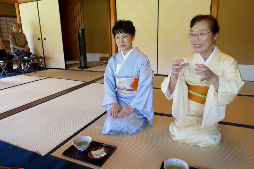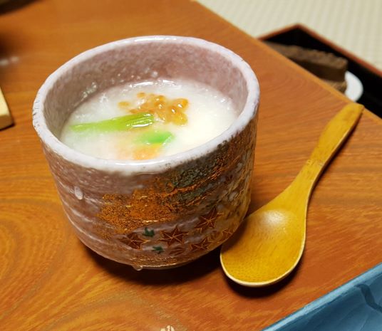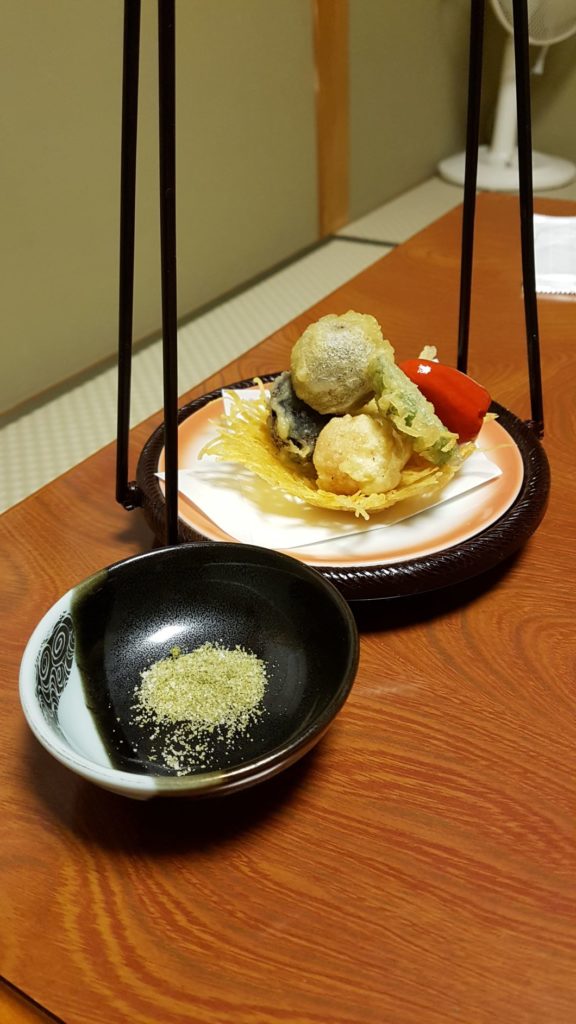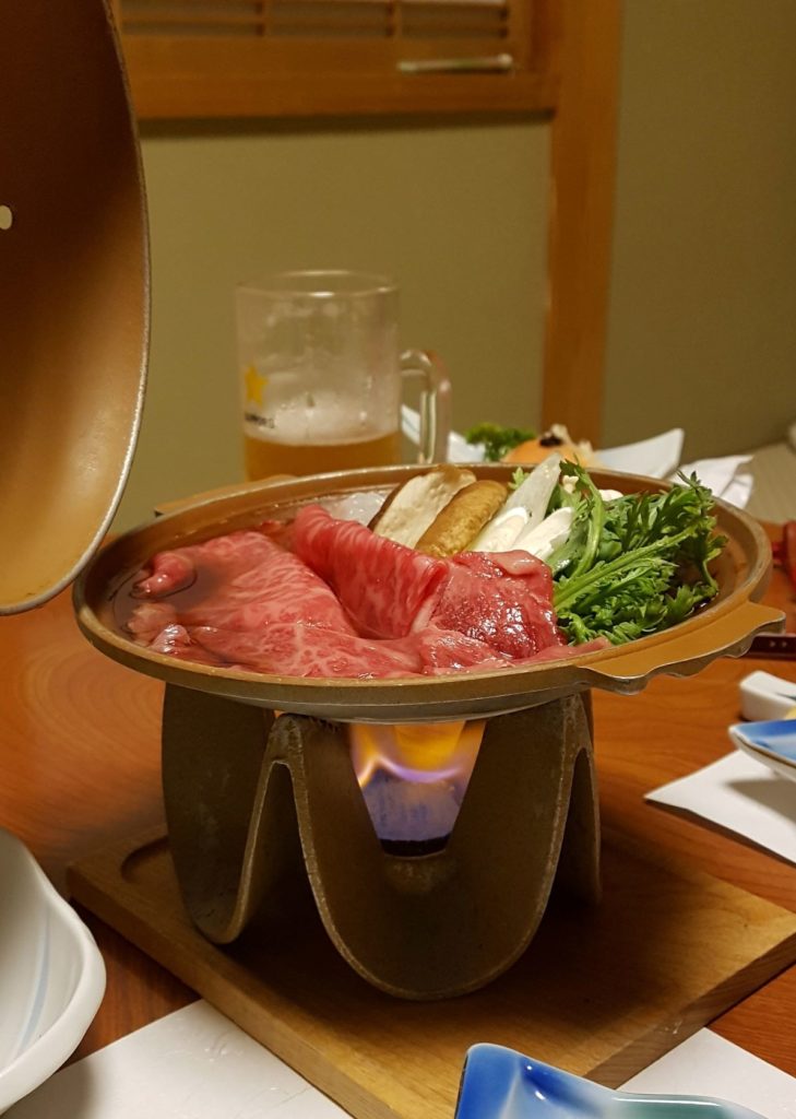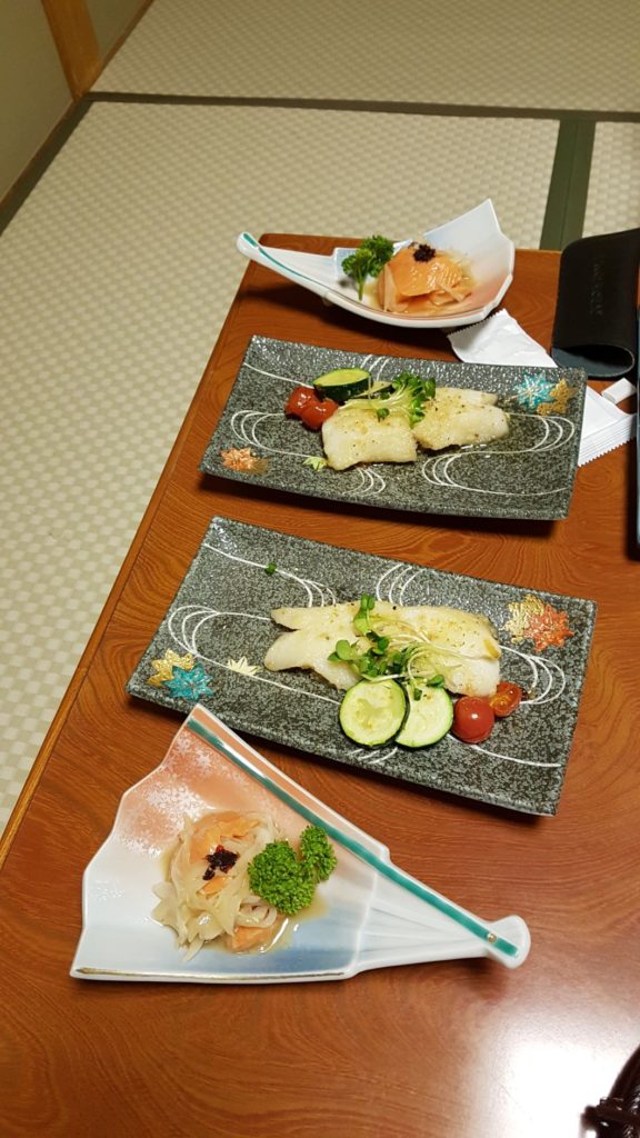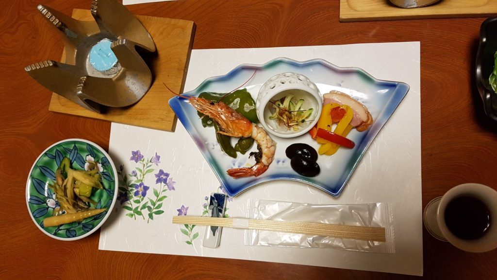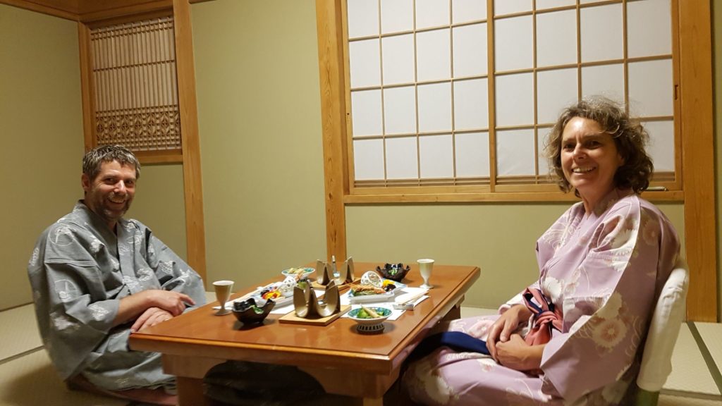 In manchen Ryokans gibt es (optional) ein Abendessen, welches die Hausfrau selber zubereitet. Hier haben wir eine völlig unbekannte drei Sterne Köchin entdeckt. Serviert wurde in einem Raum mit einem niedrigen Tisch und zwei beinlosen Stühlen, also eigentlich nur einer Rückenlehne mit dünnen Kissen. Die Gastgeberin klopft an und öffnet die Schiebetür aus Reispapier, verbeugt sich tief um dann auf Knien herbeizurutschen um den nächsten Gang aufzutragen, zu erklären und sich wieder mit wortreichem Gemurmel zu verabschieden. Die einzelnen Gerichte sind in hübschen Schüsselchen oder speziellen Gefäßen dekoriert. Manches ist – obwohl vorzüglich – nicht zu identifizieren, wildes Berggemüse, Quallenstreifen (?) … Nach vier Gängen sind wir der Meinung: Nu is aber gut, man wäre jetzt eigentlich satt. Die Rechnung war aber ohne die Wirtin gemacht, die jetzt erst so richtig aufdreht. Mit einem Stövchen wird der 7. Gang auf dem Tisch gegart, zarte Rindfleischstreifen mit diversen Beigaben. Den 8. und 9. Gang zwingen wir uns unter Höflichkeitsfloskeln auch noch hinunter, der 10. Gang, das Obst kommt mit auf’s Zimmer. Eigentlich hätten wir eine Sänfte für den Weg ins Bett benötigt.