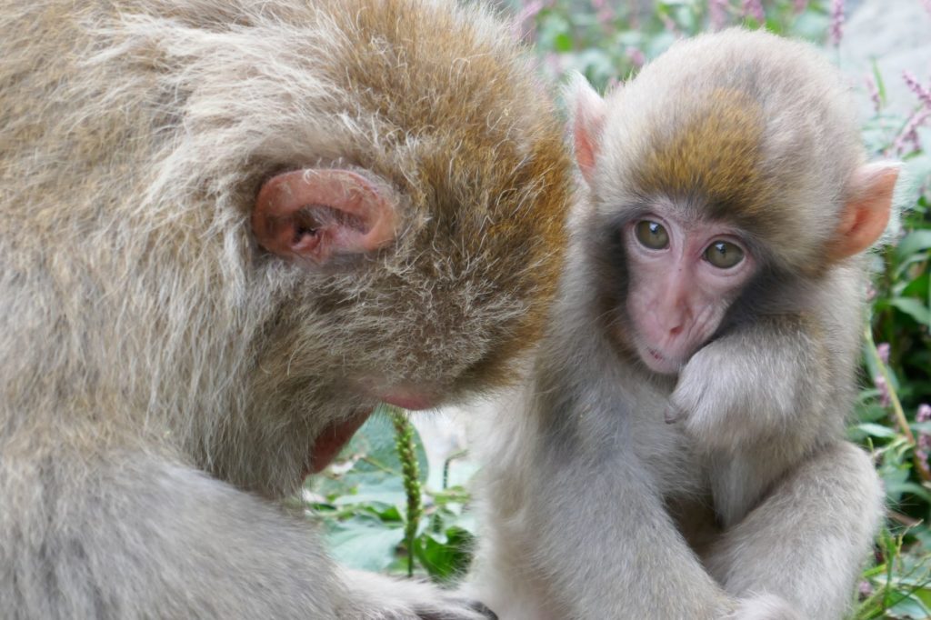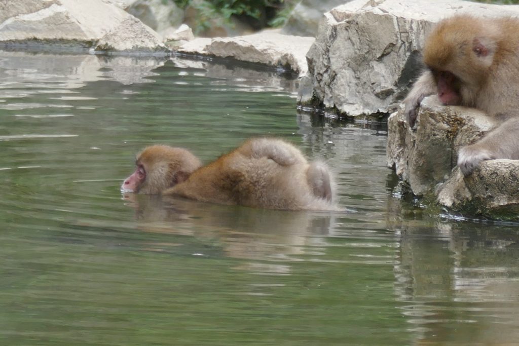 In den japanischen Alpen leben wilde Makakken, außerdem gibt es zahlreiche heiße Quellen – was liegt also näher als sich im Winter in dem warmen Wasser aufzuwärmen. Im Herbst allerdings sind die Affen nicht so blöd wie die Menschen, sich in die heiße Brühe zu legen, sie kommen aber trotzdem gerne, da sie die, von den Mitarbeitern des ‚Parks‘ ausgestreuten Reiskörner schätzen und sorgsam Korn für Korn (beidhändig gleich geschickt) als Snack verputzen. Es sind bestimmt über 100 Affen zugegen, allesamt selten entspannt, die Besucher kaum zur Kenntnis nehmend. Die Menschen werden gebeten, einen Meter Abstand zu den Affen zu wahren, die Affen werden umgekehrt darum nicht gebeten… Es ist ein wildes Treiben, besonders die Kleinen balgen sich unentwegt zu zweit, zu dritt, zu viert, ein ganzes Knäuel Affenbabies – wenn sie nicht gerade von der Mutter gelaust und gesäugt werden. Überhaupt sind alle ständig mit der gegenseitigen Fellpflege beschäftigt, das wohlige Gefühl derer, die gerade behandelt werden, ist ihnen ins Gesicht geschrieben.