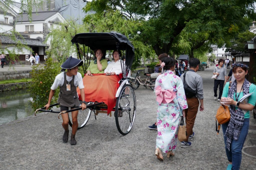 Nur die kleiner Stadt Kurashiki in der Nähe von Okayama macht hier eine Ausnahme, es gibt ein Viertel mit alten und wirklich hübschen Holzhäusern mit einem Kanal und ein paar Bäumen. Trotzdem gibt es weder am Wasser noch sonst Sitzgelegenheiten oder ein Cafe. Man muss akzeptieren und sich abfinden damit, dass die Japaner das ‚draußen sein‘ nicht ausstehen können und es nur ganz wenige westliche Touristen gibt, die da dagegen halten würden. So ist jedes Lokal, ja sogar die dünnwändigen Teehäuser, klimatisiert und oft fensterlos. Besonders Japanerinnen vermeiden jeglichen Kontakt mit Sonnenschein, mit armlangen weißen Handschuhen, Sonnenschirm oder Hut. Ansonsten laufen sie in langen Kleidern und Hosen herum, völlig anders designed als bei uns, aber oft sehr chic. Es gibt aber auch Kleidungsstücke, die eher eine Melange aus kariertem Sack und Bademantel sind – für die nicht mehr ganz jungen Frauen.