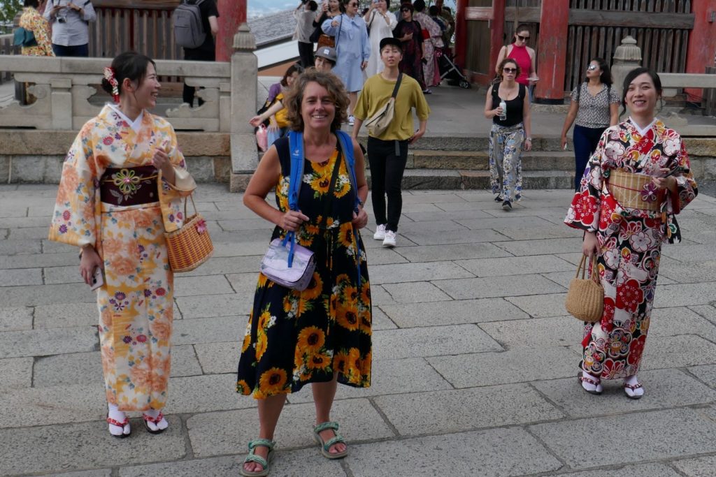 Besonders in Kyoto aber nicht nur dort sieht man viele Frauen und manche (dazu verdammte?) Ehemänner in Kimonos mit entsprechenden Pantoffeln herumstolzieren. Keineswegs, so versicherte uns eine perfekt Deutsch sprechender Kyote, handele es sich um Japanerinnen, sondern vielmehr fast ausschließlich um chinesische Touristinnen, die sich aus den Verleihshops in den Souveniergassen bedienen würden. Mindestens ein (deutsches?) Paar hatte sich ebenfalls in einem solchen Kleidungsjuwel verfangen und jeglichen Chic durch die üppige Leibesfülle ruiniert, es passt halt nicht ganz so universell wie ein Dirndl, welches sich ja für die Wiesn auch zum Touristen-Standard entwickelt hat. Der Ablauf des Kimonospektakels wiederholt sich alle paar Trippelschritte auf dem Weg zum Tempel in den 4 Stufen: Posieren, Selfieren, Postieren und Warten auf die Liker.